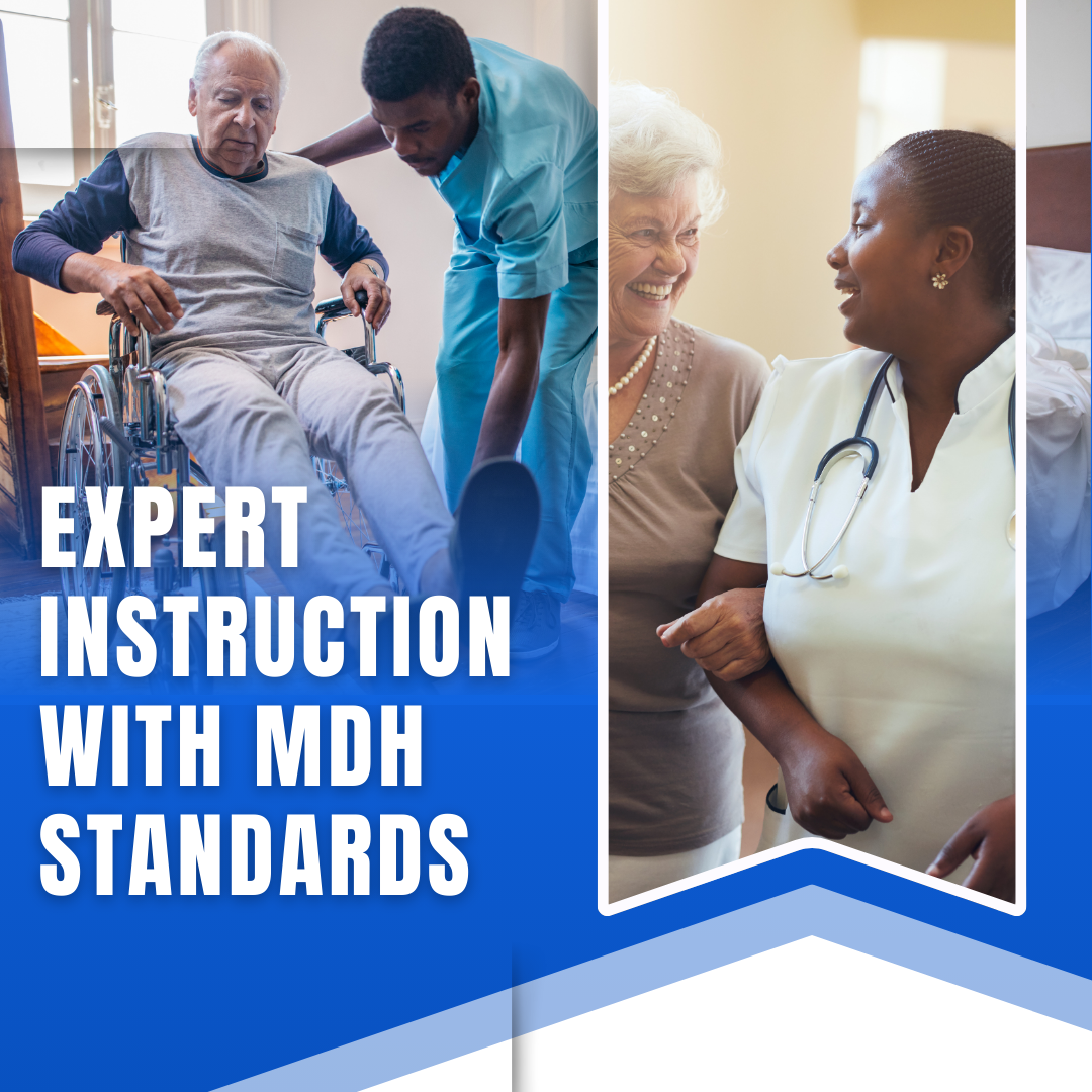 Lessons are delivered by qualified instructors in compliance with MDH requirements and focuses on developing the knowledge, skills, and professional behaviors necessary to provide safe, effective, and people-centered healthcare.